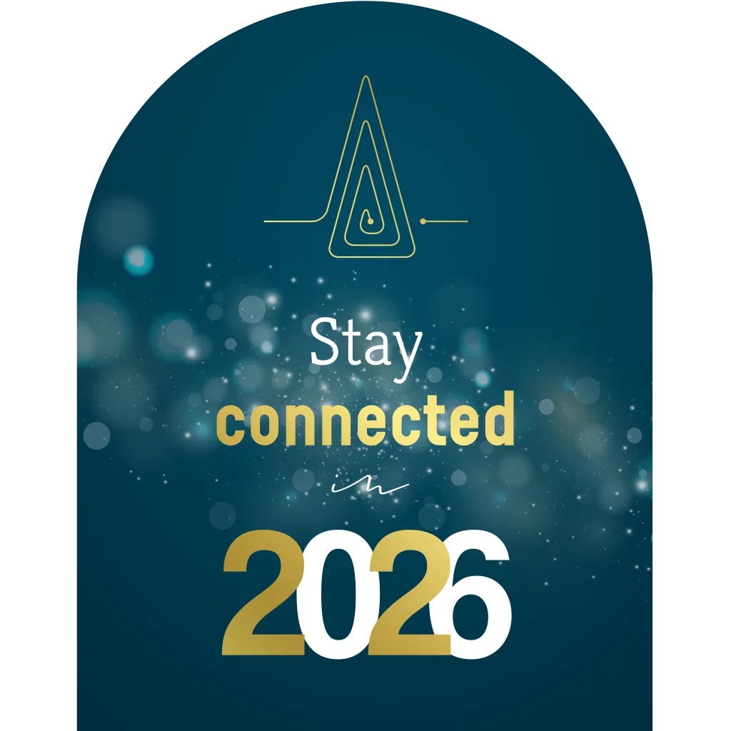 Wens je zakelijke relaties, medewerkers en klanten een fijne kerst en een gelukkig 2026 met deze luxe zakelijke kerstkaart. Uniek aan deze kerstkaart is de aparte vorm, namelijk de vorm van een boog, en het gebruik van échte goudfolie. Op deze kaart een sprankelende blauwe achtergrond met de tekst ´Stay connected´. De afbeelding van het logo op de achterzijde dient als voorbeeld en wordt niet gedrukt. Deze kun je verwijderen of plaats hier je eigen logo overheen.