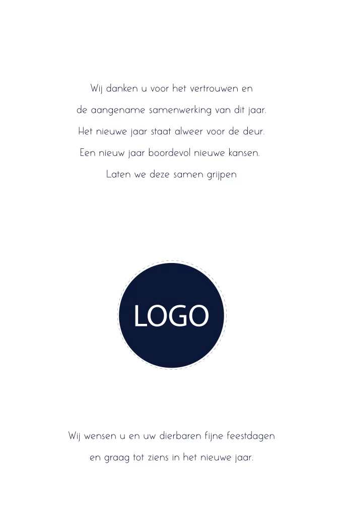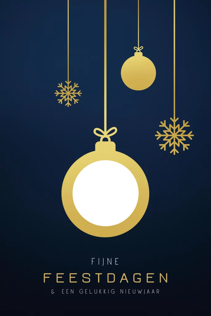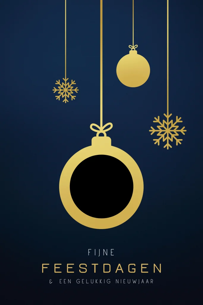 Wens al je zakelijke relaties, medewerkers en klanten fijne feestdagen toe met deze unieke zakelijke kerstkaart. Op deze kaart staan gouden kerstballen en sneeuwvlokken tegen een donkerblauwe achtergrond. Uniek aan deze kerstkaart is de ronde uitsnede aan de voorzijde, waardoor je het logo van je bedrijf ziet.