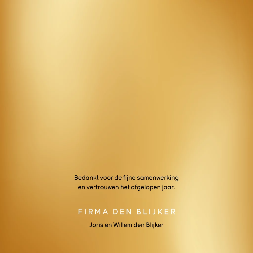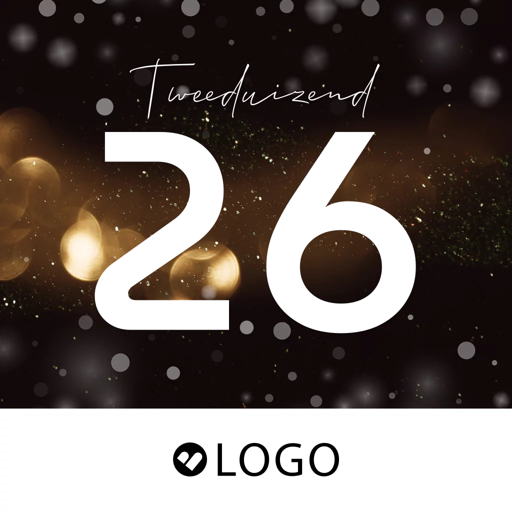 Prachtige zakelijke kerstkaart met uitsnede van het jaartal '26 in goudlook. Op de zwarte achtergrond sprankelende licht sparkles wat een feestelijk effect geeft. De goudlook en uitsnede van het jaartal 2026 geeft een luxe touch aan deze strakke zakelijke kerstkaart. Pas de kleuren, teksten en lettertypen gemakkelijk aan in de editor.