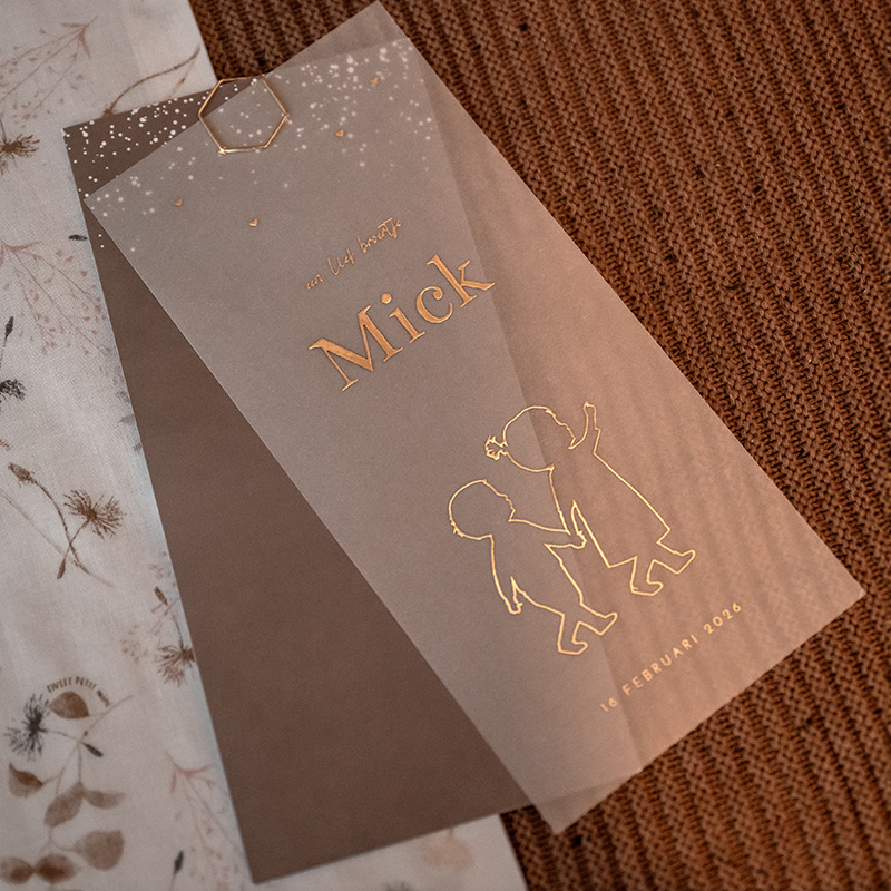 Geboortekaartje Mick voor een jongen met een stoere achtergrondkleur en kleine spetters. Op de achterzijde is ruimte voor de geboortegegevens. Op de kalkpapier cover van semitransparant papier staat een outline silhouet van een grote zus hand in hand met een klein baby broertje. Het silhouet en de teksten op deze kalkpapieren cover worden gedrukt in écht goudfolie. Dit kun je naar je eigen smaak wijzigen naar roséfolie, koperfolie, zilverfolie of zwartfolie.