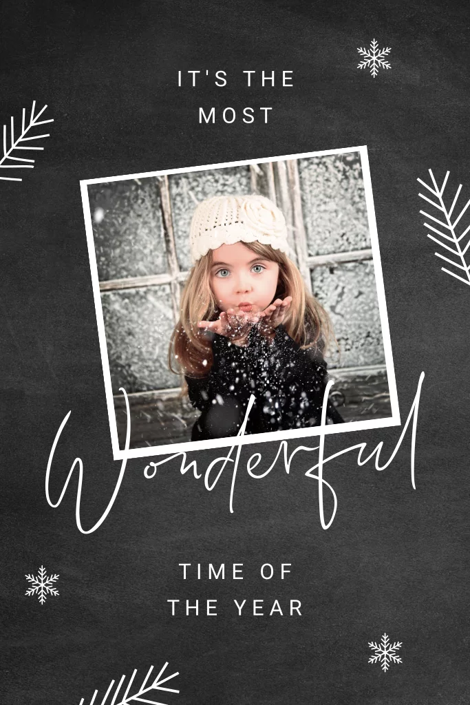Hippe kerstkaart met goudfolie en een krijtbord achtergrond.Voeg je eigen persoonlijke foto toe. Deze kaart is gedecoreerd met takjes en sterretjes. Door de goudfolie krijgt de kaart een exclusieve uitstraling. Ook mogelijk met koperfolie, zilverfolie of roséfolie. Dit is aan te passen in de editor.