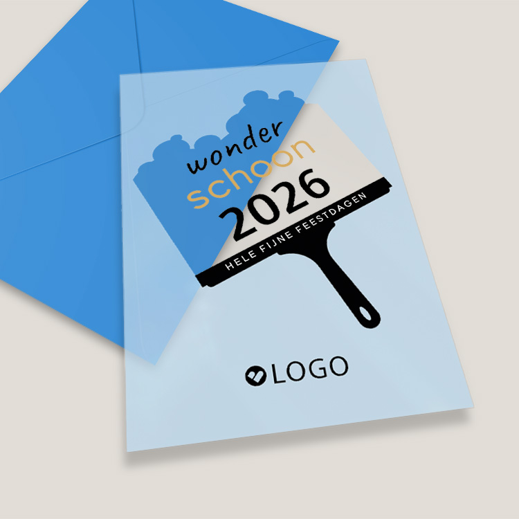 Wens je medewerkers en zakelijke relaties op een unieke manier fijne feestdagen met deze bijzondere kerstkaart. Deze zakelijke kerstkaart wordt op helder transparant acryl, ook wel plexiglas genoemd, gedrukt. Op deze bijzondere kerstkaart zie je een raamwisser die het glas schoonmaakt en daaronder verschijnt de tekst 'wonderschoon 2026'. Deze doorzichtige kerstkaart past daarom perfect bij een schoonmaakbedrijf zoals een glazenwasser. De afbeelding van het logo dient als voorbeeld en wordt niet gedrukt. Deze kun je verwijderen of plaats hier je eigen logo overheen. Pas de teksten, lettertypes en kleuren gemakkelijk aan in de editor.