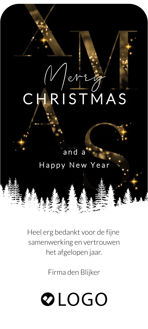 Feestelijke kerstkaart in goud en zwart voor zakelijke relaties. Personaliseer deze digitale kerstkaart eenvoudig met onze online editor en voeg een eigen bedrijfslogo toe.