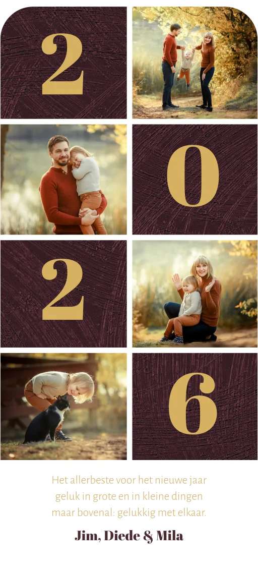 Stuur een warme nieuwjaarsgroet met deze eigen foto kerstkaart. Op deze kaart zie je een collage van eigen foto's en het jaartal 2026 staan.