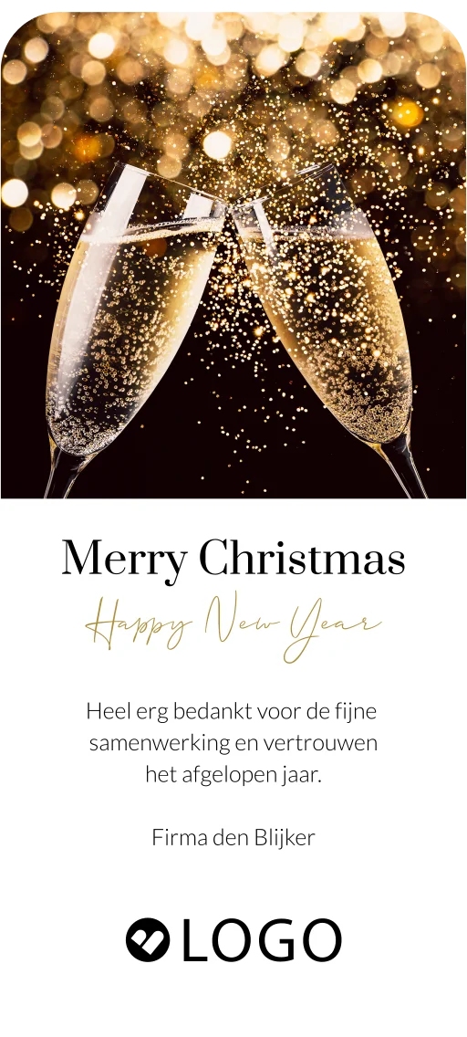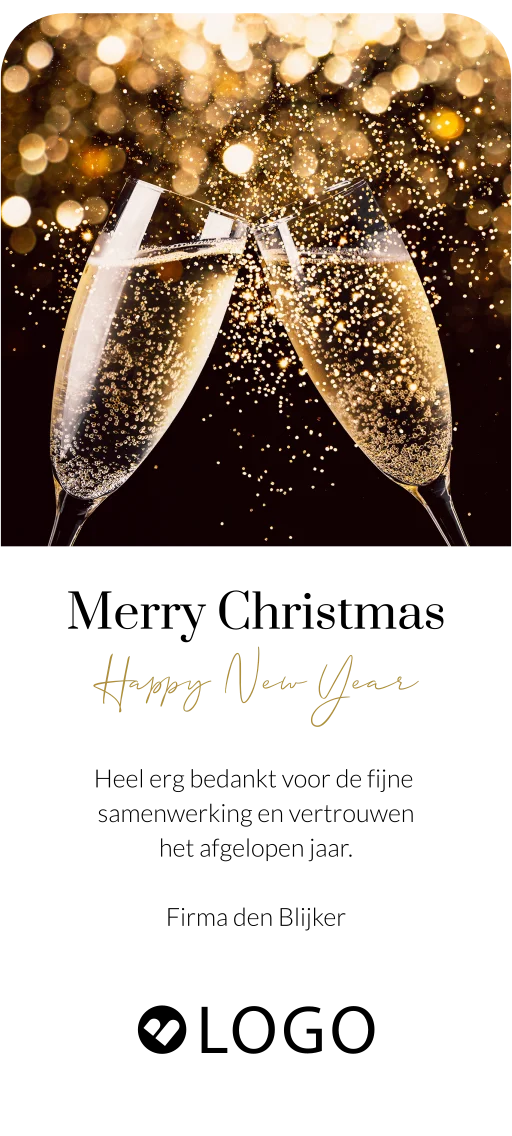 Een stijlvolle digitale kerstkaart met logo voor zakelijke wensen. Op deze digitale kerstkaart zie je een mooi sfeerbeeld van proostende champagneglazen. Voeg een eigen logo toe in de editor voor de persoonlijke touch.