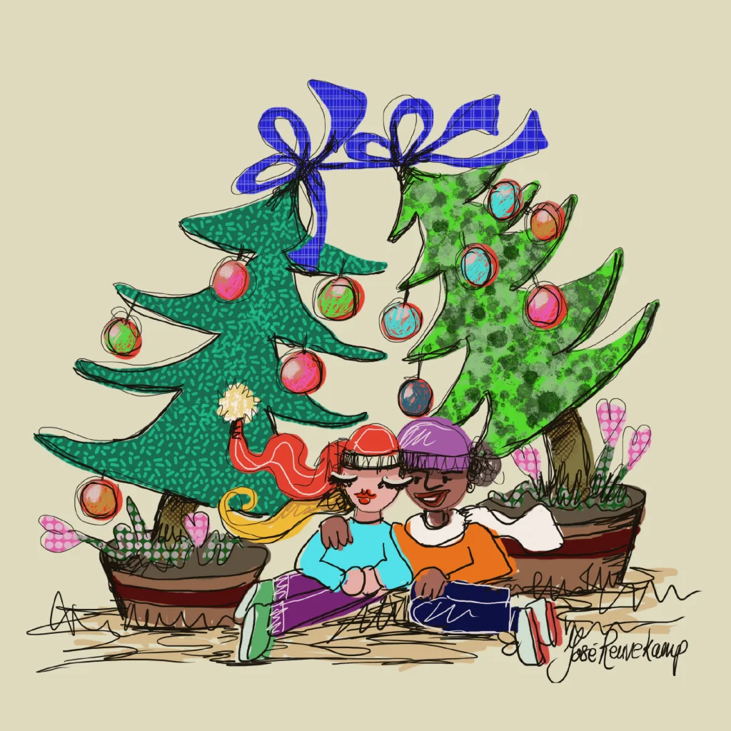 Wens al je vrienden, familie en kennissen fijne feestdagen toe met deze kerstkaart en steun tegelijkertijd het goede doel. Deze kleurrijke kerstkaart is speciaal ontworpen voor het Ronald McDonald Huis Zwolle door kunstenares Jose Reuvekamp. Op de voorzijde zie je een illustratie van 2 mensen onder de kerstboom. In de kerstboom hangen kleurrijke kerstballen en hartjess.