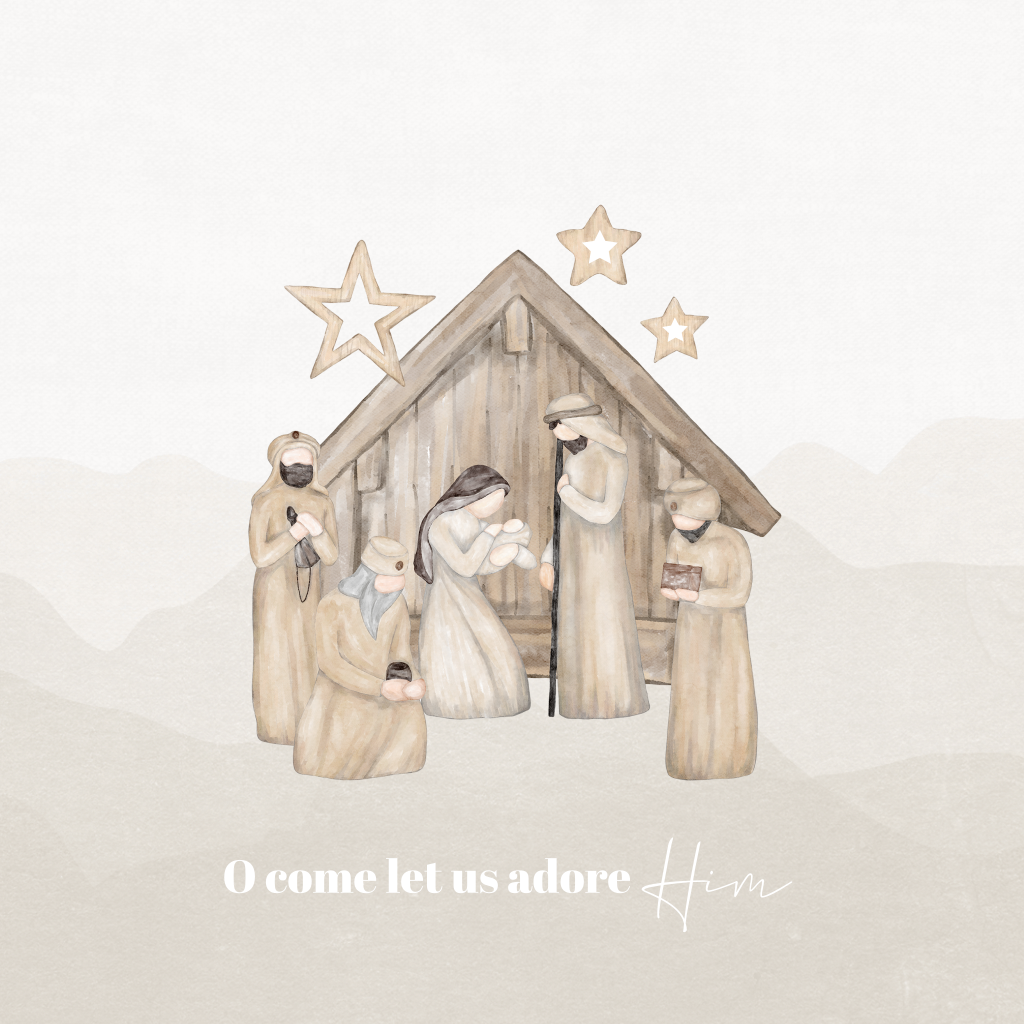 Luxe christelijke kerstkaart met trendy nude kleuren. Wens hiermee je familie en vrienden fijne feestdagen en een gezegend nieuwjaar. Op deze kaart een aquarel van een kerststal met maria, jozef, baby jezus en de drie koningen. De sterren en tekst 'O come let us adore him' wordt gedrukt in echt goudfolie. Dat geeft een exclusieve uitstraling aan deze christelijke kerstkaart.