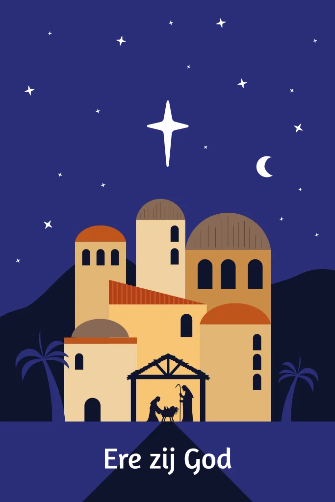 Wil je je familie en vrienden een hippe christelijke kerstkaart sturen? Kies dan voor deze kerstkaart met een illustratie van de stad Bethlehem. In de stad staat een kerststal met Jozef, Maria en kindeke Jezus. Op de achtergrond een nachthemel met sterren en de tekst ´Ere zij God´ in goudfolie. Door het gebruik van goudfolie heeft deze kerstkaart een extra exclusieve uitstraling. Met deze prachtige kaart wens je iedereen fijne feestdagen toe!
