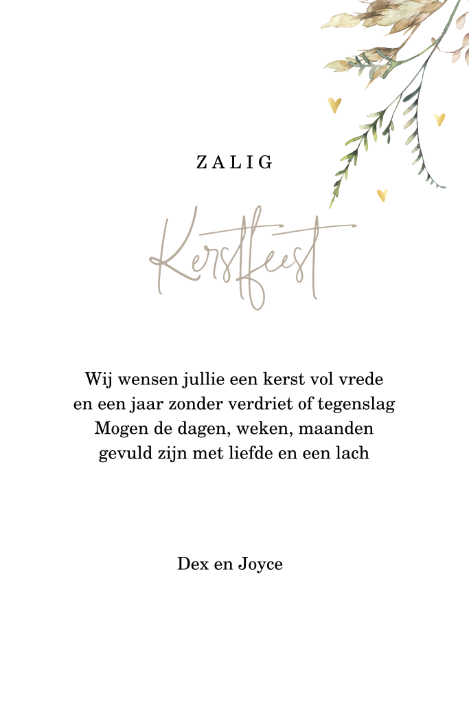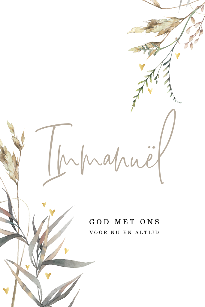 Stijlvolle christelijke kerstkaart met mooie gedroogde bloem takjes. De naam Immanuël staat geschreven in een sierlijk lettertype, daaronder staat de vertaling 'God met ons' en de tekst voor nu en altijd. Tussen de droogbloemen staan enkele goudkleurige hartjes. Deze geven de kaart een liefdevolle uitstraling. De teksten zijn gemakkelijk aan te passen in de editor.
