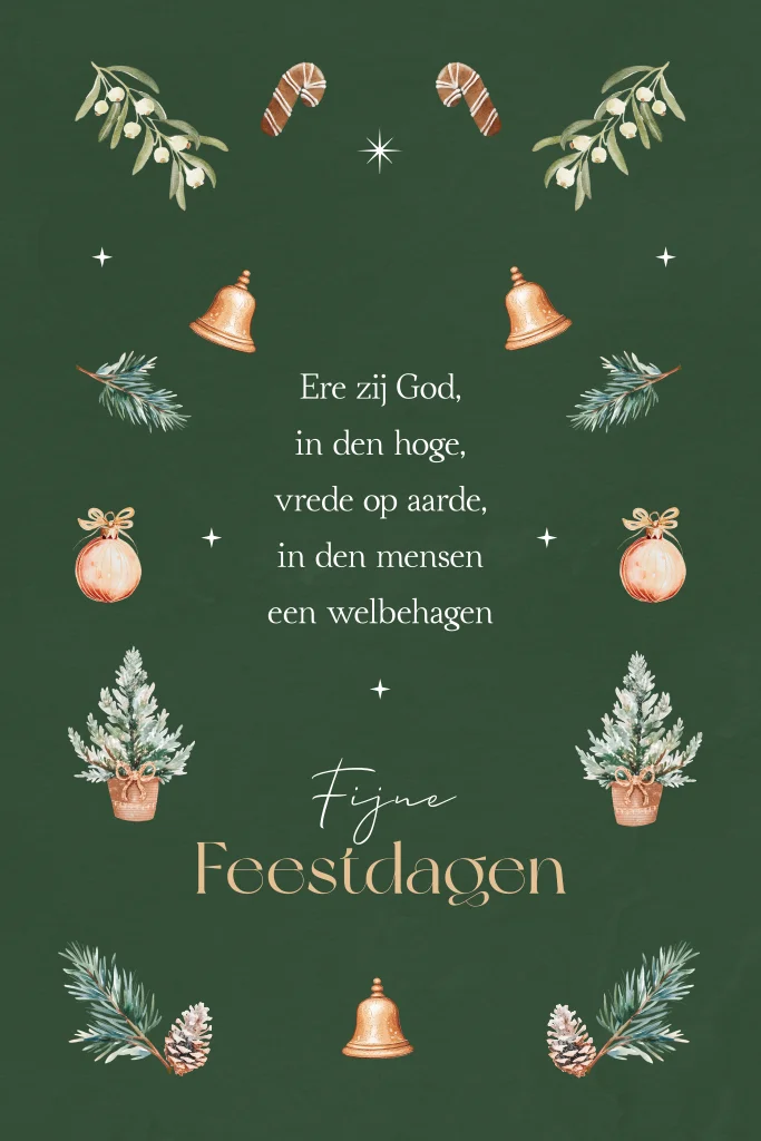 Een nostalgische Christelijke kerstkaart met allerlei aquarel kerst illustraties. Op deze kaart zie je illustraties van een kerstboompje, schaatsen, kersttakjes, kerstballen en kerstbellen. Op deze kerstkaart staat de Christelijke tekst: