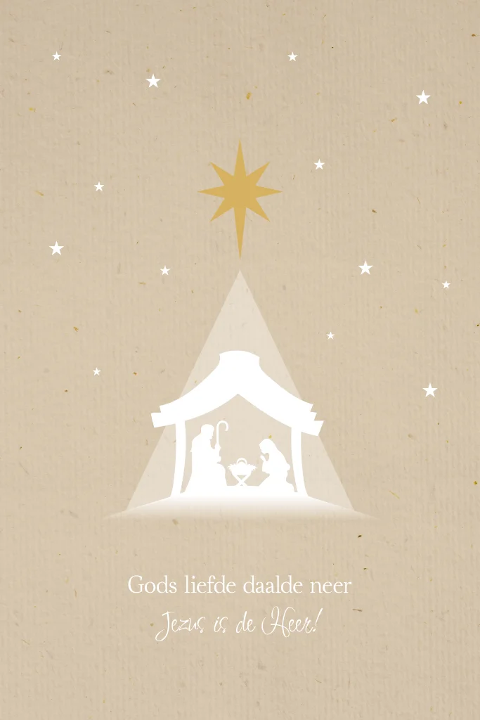 Christelijke kerstkaart met kerststal met kribbe en kerstster. Boven de kerststal schijnen de sterren. De kaart heeft een papierlook achtergrond. Verder staat er de christelijke tekst 'Gods liefde daalde neer, Jezus is de Heer!' Met deze prachtige kaart wens je iedereen fijne feestdagen toe!