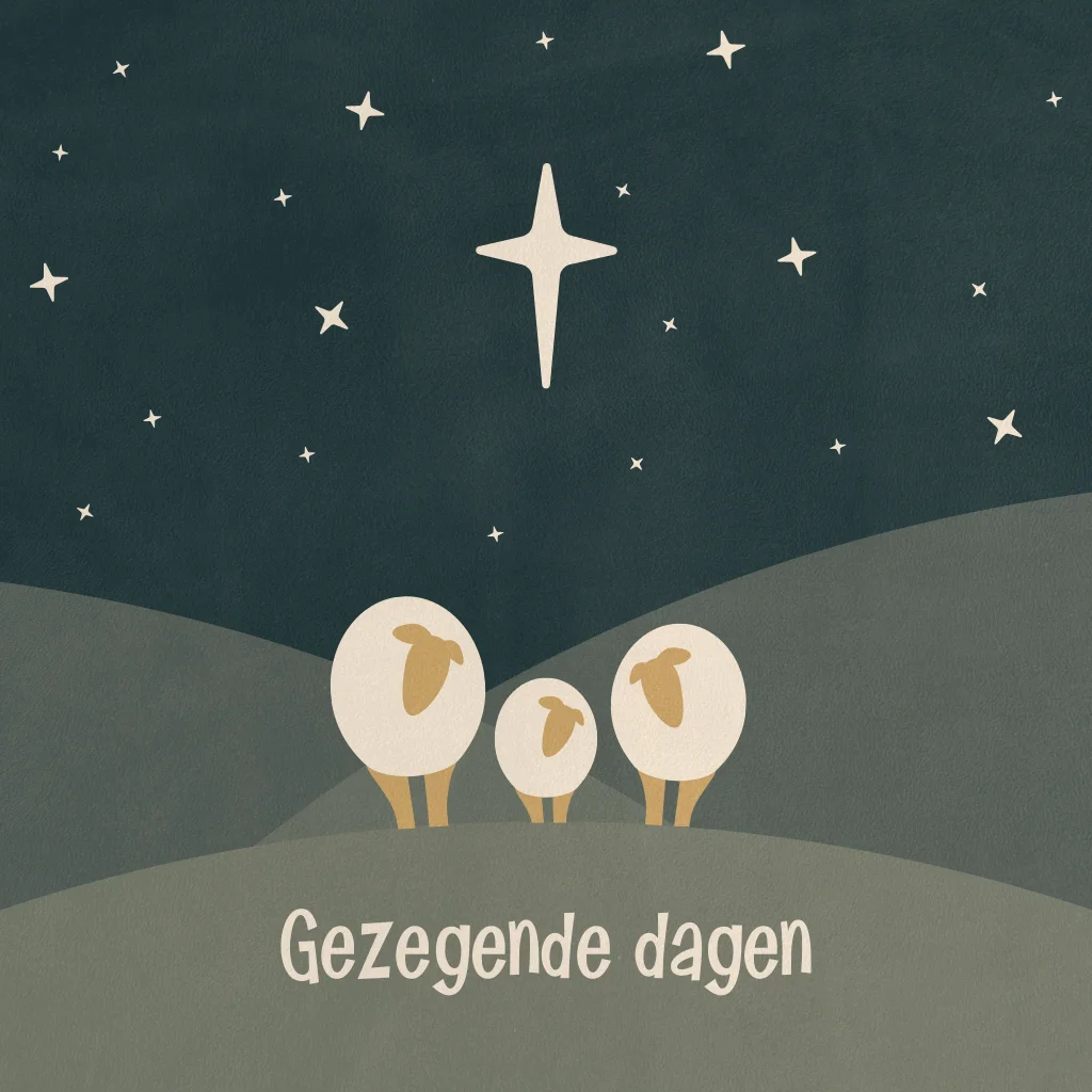 Wens je dierbaren gezegende dagen met deze christelijke kerstkaart. Op de kaart staat een illustratie van een sterrennacht met schapen in een weiland. Pas deze christelijke kaart geheel naar eigen wens aan in de editor.