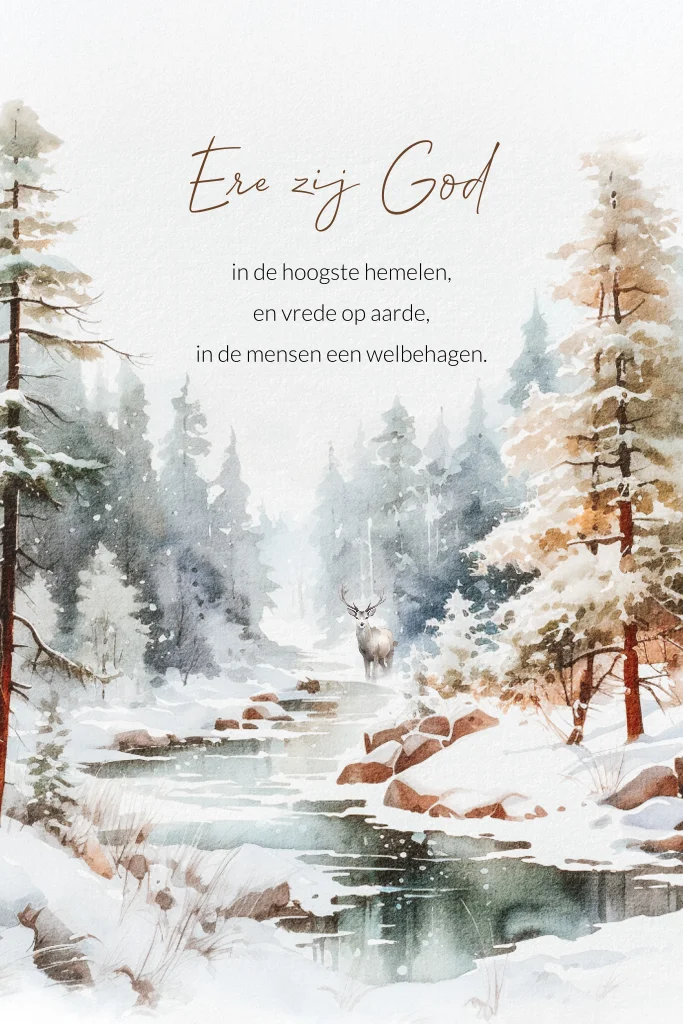 Op zoek naar een fraaie Christelijke kerstkaart voor dit winterse seizoen? Ontdek dan deze prachtige Christelijke kerstkaart met een betoverend winterlandschap. In het winter landschap zie je bomen bedenkt met sneeuw, een riviertje en een rendier. Op deze kerstkaart staat op de voorzijde de Christelijke kerstwens Ere zij God.
