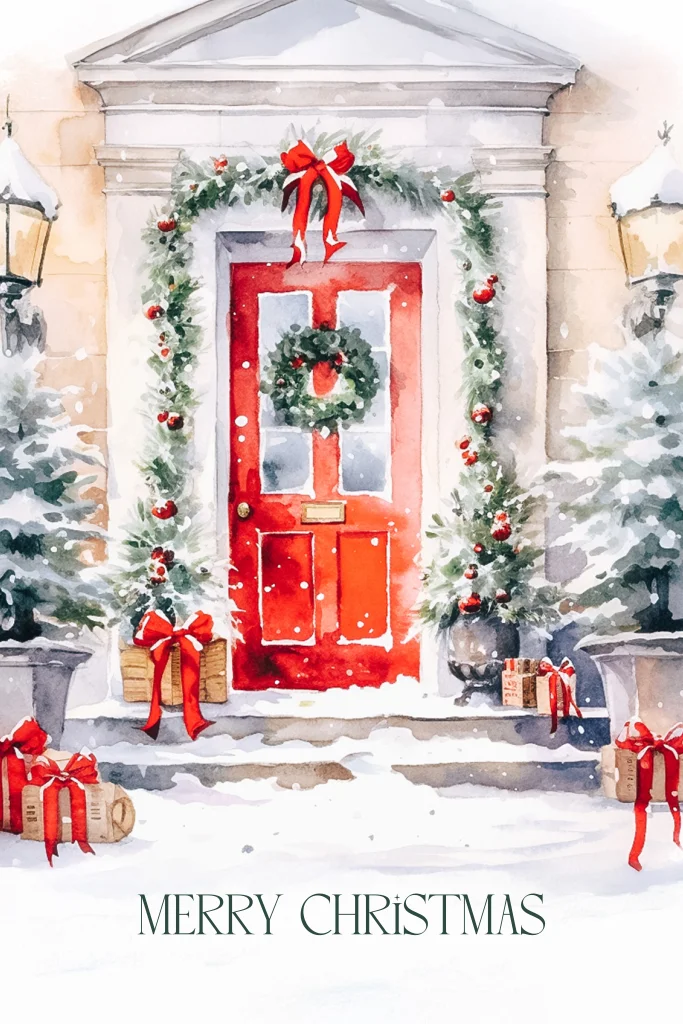 Een sfeervolle winterse aquarel kerstkaart. Deze kaart heeft een nostalgische sfeer door de aquarel vormgegeven illustraties. Op deze kaart zie je een winterse voordeur omringt met een kerstkrans en kerstversieringen in een winters plaatje. Stuur deze prachtige vintage kerstkaart naar vrienden en familie en laat diegene weten dat je aan hem of haar denkt.