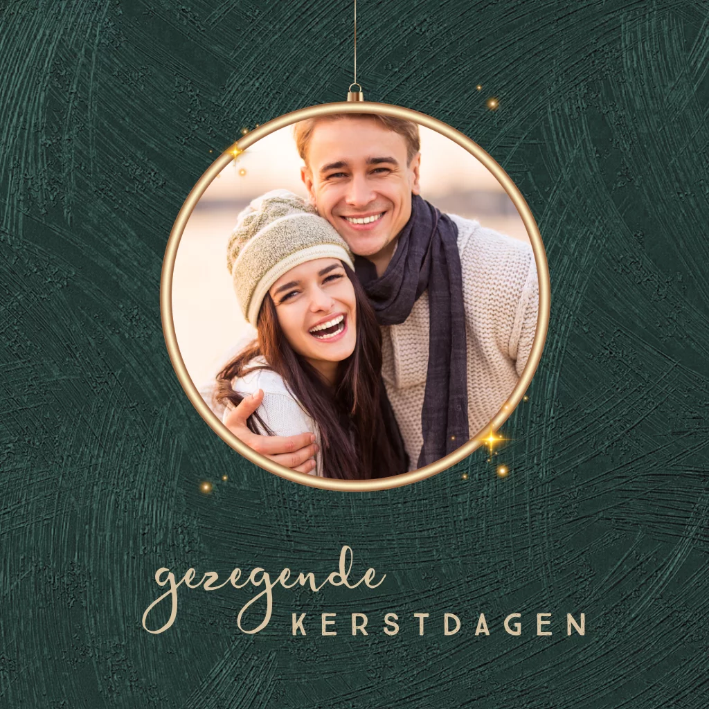 Een hippe Christelijke kerstkaart met afgeronde hoeken en chique groene achtergrond. Op deze kaart staan goudkleurige kerstbal waarin een foto is geplaatst van een jong stel. In de kerstbal voeg je heel makkelijk jullie eigen foto toe. In sierlijke letters staat de tekst ' gezegende kerstdagen'.