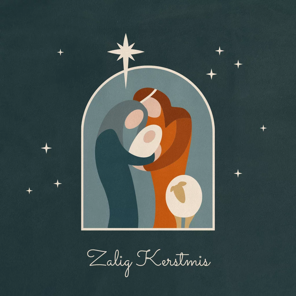 Wens met deze christelijke kerstkaart je dierbaren een zalig kerstmis. Je ziet op deze kerstkaart een illustratie van Jezus, Maria en kindeke Jezus. Ze staan in een arch vorm met sterren om hun heen. De ronde hoeken bij dit ontwerp zorgen voor een hippe uitstraling.
