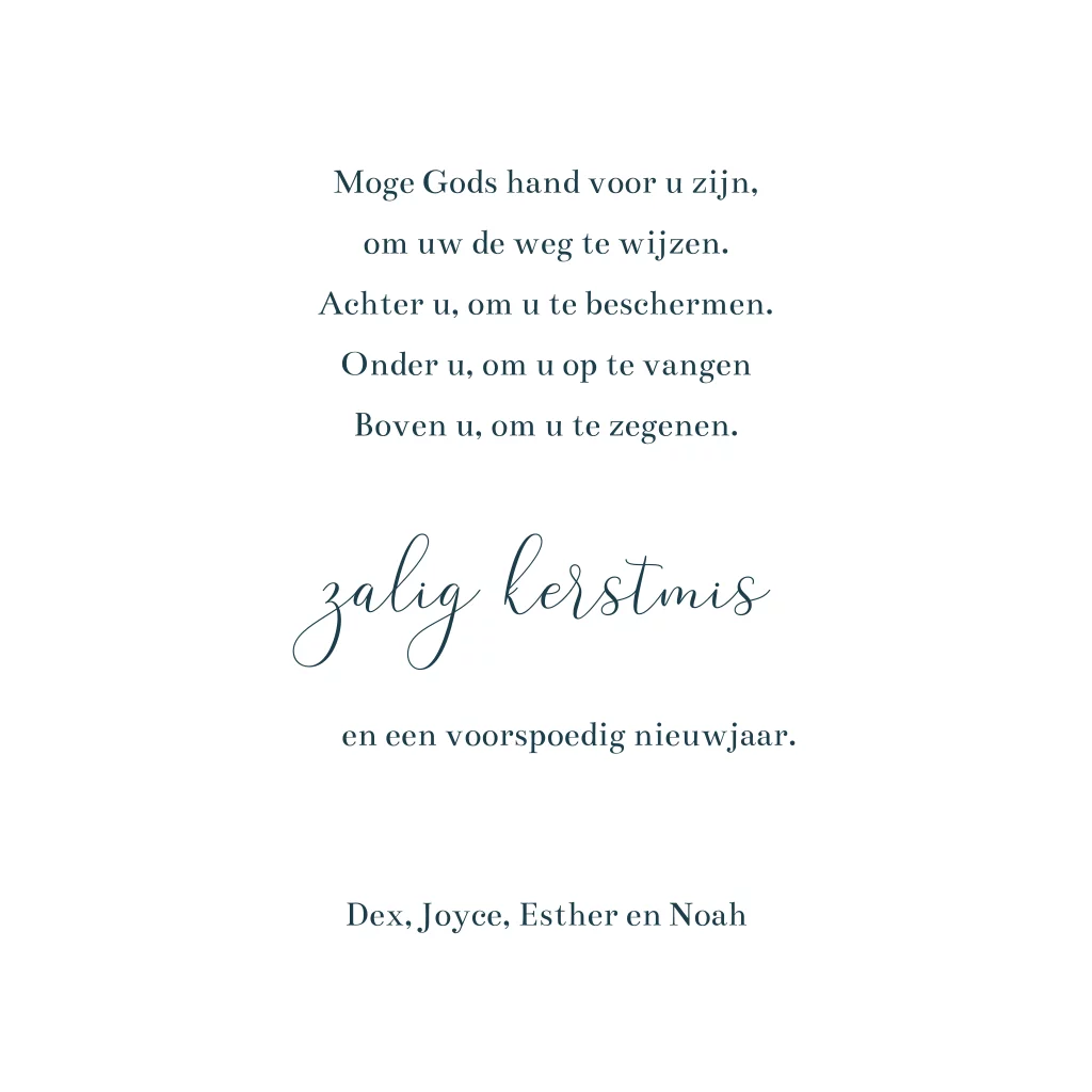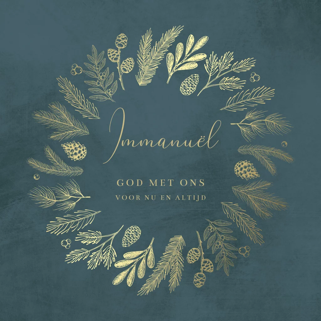 Christelijke kerstkaart met een goudkleurige kerstkrans vol met dennentakken. In de kerstkrans staat de tekst; Immanuël God met ons voor nu en altijd. De gouden krans komt mooi uit op de groene achtergrond.