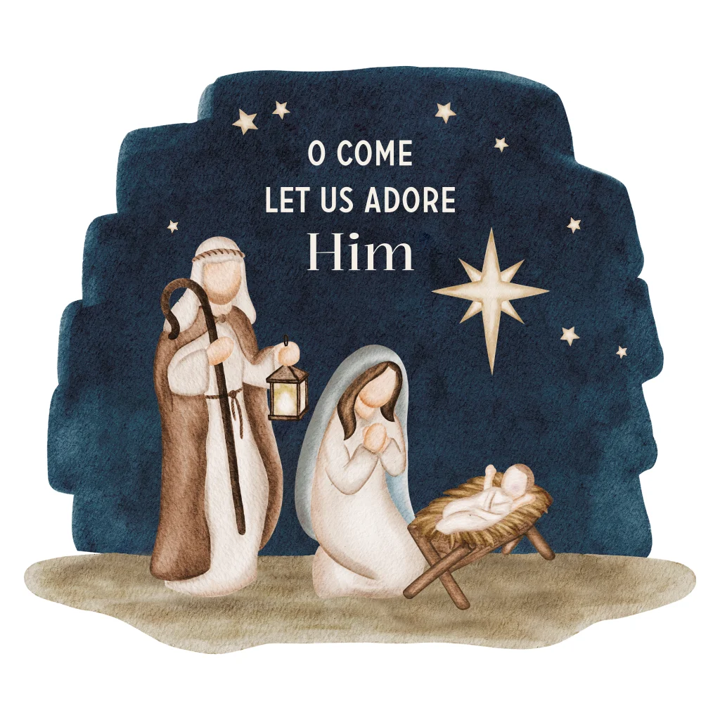 Prachtige kerstkaart met Jozef, Maria en kindje Jezus in de kribbe. Op deze kerstkaart staat de tekst 'O come let us adore him'. De christelijke illustraties zijn vormgegeven in aquarel stijl. Pas deze christelijke kerstkaart naar eigen wens aan in onze online editor en maak de kaart af met de zand envelopkleur.