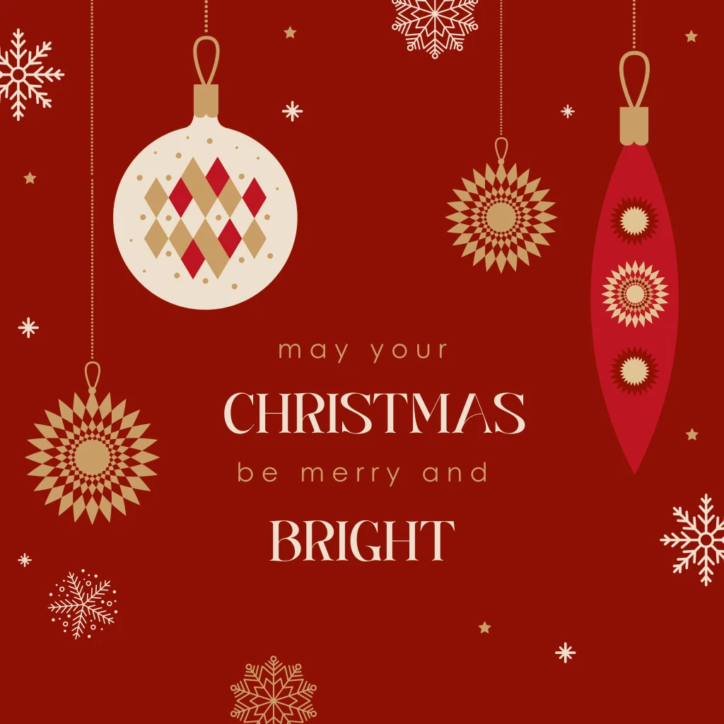 Christelijke rode kerstkaart met kerstballen en sterren. Op deze kaart staat de tekst;' May your Christmas be merry and bright' in verschillende lettertypes. De kleren van deze kaart zijn rood en goud.