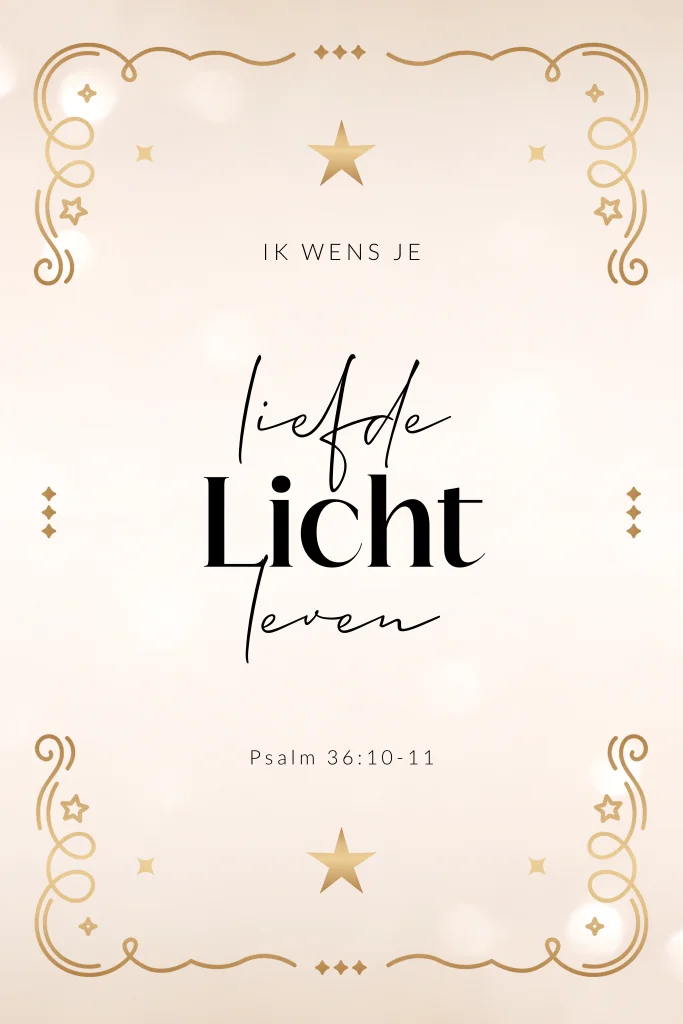 Christelijke kerstkaart met een boodschap afkomstig uit Psalm 36:10-11. Op deze kaart staat de tekst "Ik wens je liefde, licht en leven"