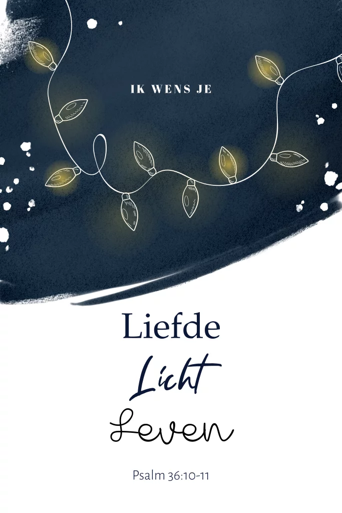 Christelijke kerstkaart met een lichtslinger en brandende lampjes. Op deze kerstkaart staat een boodschap afkomstig uit Psalm 36:10-11. Ik wens je liefde, licht en leven. Deze kaart is naar je eigen smaak te bewerken in de editor.