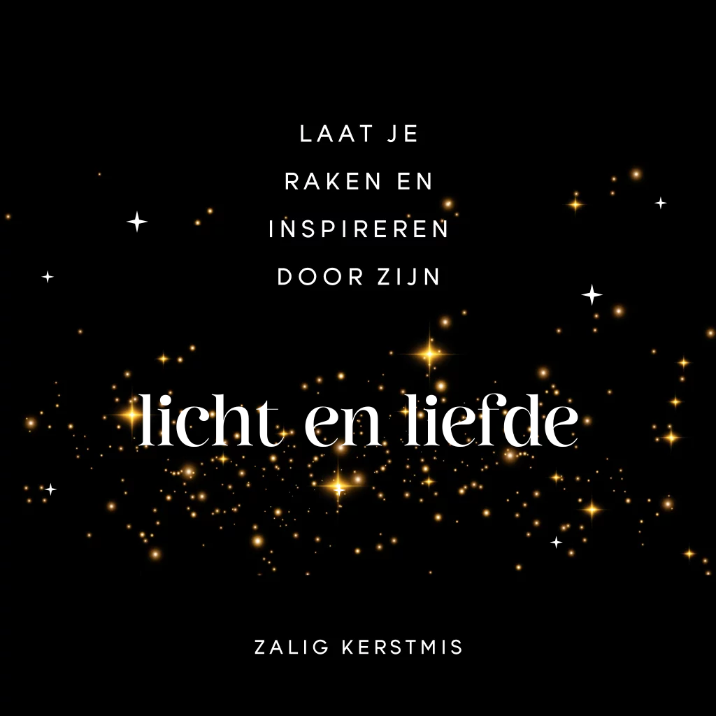 Feestelijke Christelijke kerstkaart met foliedruk met de kerstwens; Laat je raken en inspireren door zijn licht en liefde. Deze kerstkaart met glitters en sparkles geeft gelijk een feestelijk kerstgevoel. De kaart is zwart met gouden foliedruk wat een luxe uitstraling geeft. Op de voorkant van deze kaart staat ook de tekst zalig kerstmis.