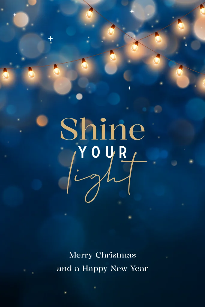 Christelijke kerstkaart met een mooie donkerblauwe achtergrondkleur en sfeervolle brandende lichtjes. Op deze kaart staat de tekst "Shine your light" Voeg je eigen persoonlijke kerstgroet toe. Kleuren en lettertypes zijn aan te passen in de editor.