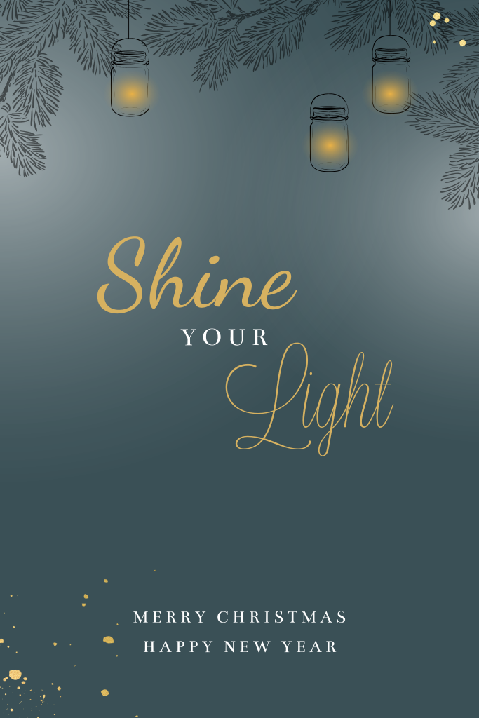 Christelijke kerstkaart met een mooie donkerblauwe achtergrondkleur, kersttakjes en sfeervolle brandende lichtjes. Op deze kaart staat de tekst "Shine your light" Voeg je eigen persoonlijke kerstgroet toe. Kleuren en lettertypes zijn aan te passen in de editor.