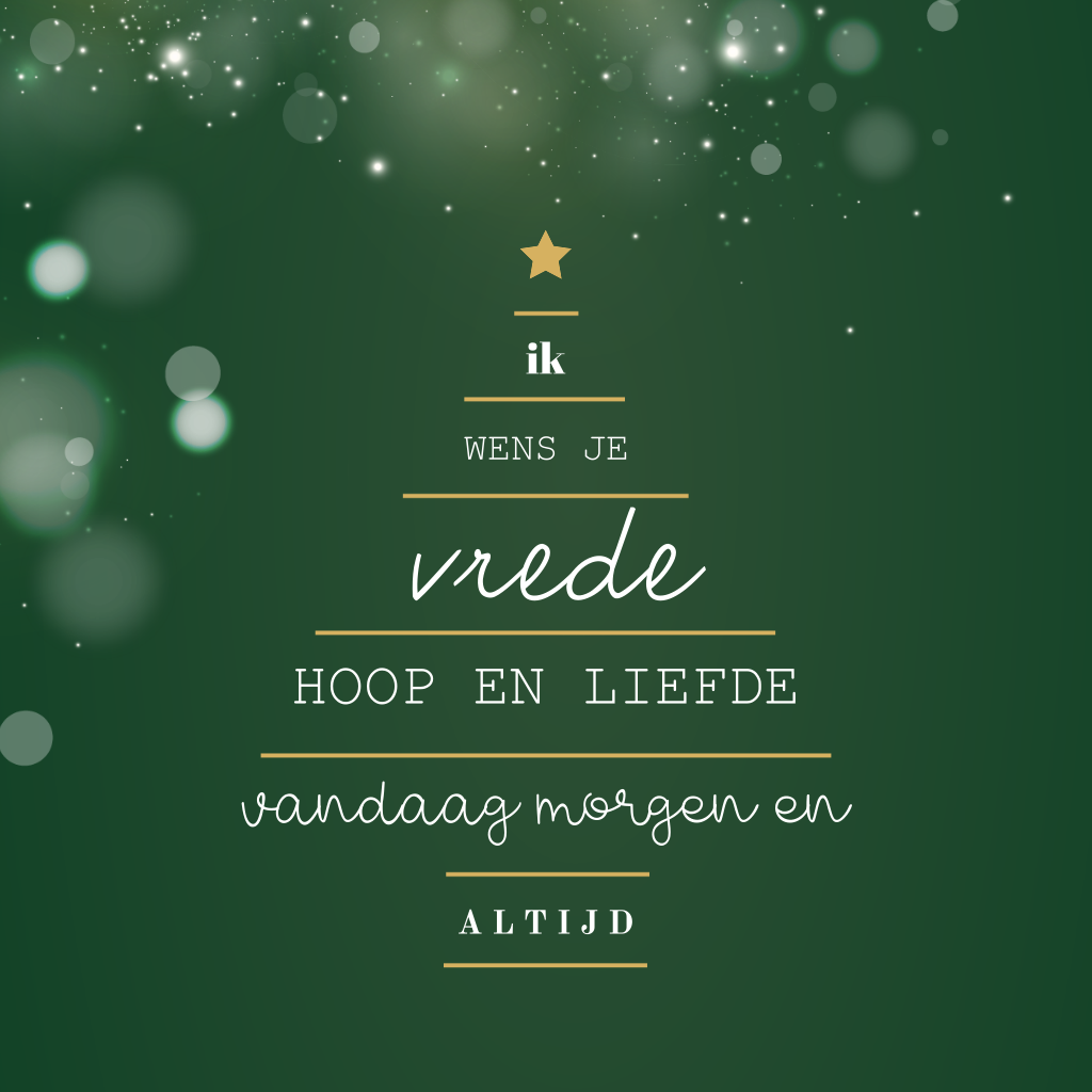 Stijlvolle Christelijke kerstkaart met de tekst "ik wens je vrede, hoop en liefde, vandaag morgen en altijd." De witte tekst en gouden lijnen vormen een kerstboom en komen mooi naar voren op de groene sprankelende achtergrond. Pas deze kaart naar je eigen smaak aan in de editor.