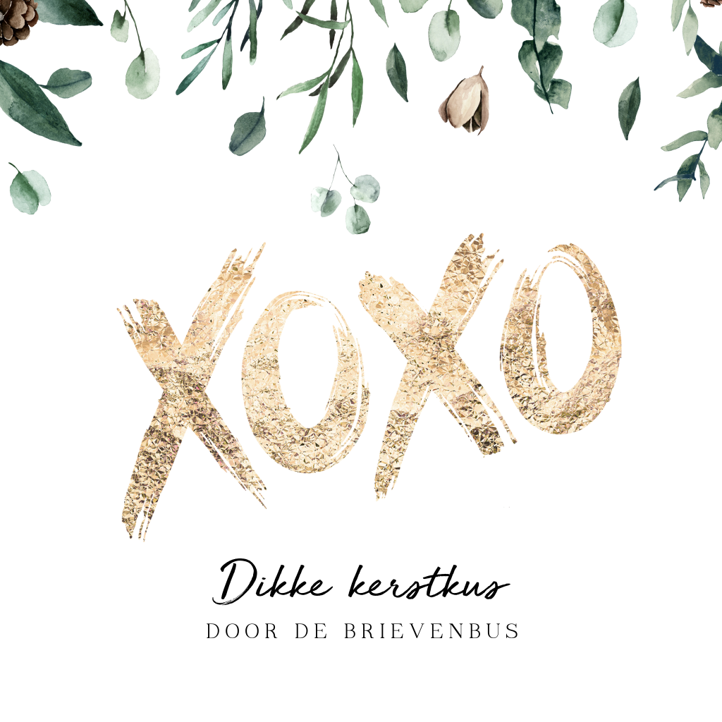 Dikke kerstkus door de brievenbus! Met xoxo verstuur je knuffels en kusjes. Een kerstkaart met een lieve groet en de beste wensen voor het nieuwe jaar. Op deze kaart staan groene kerst takjes en xoxo in een mooie gouden kleur. Teksten en lettertypes zijn aan te passen in editor.