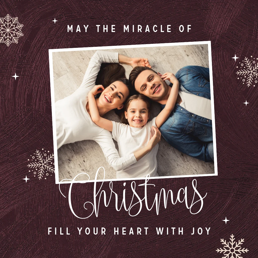 Christelijke foto kerstkaart met goudfolie, een chique aubergine of donker paarse achtergrond en sneeuwsterren. De foto van het gezin kan makkelijk worden vervangen door een eigen foto. Op deze kaart staat de tekst; " may the miracle of Christmas fill your heart with joy". Door de goudfolie krijgt de kaart een exclusieve uitstraling. Ook mogelijk met koperfolie, zilverfolie of roséfolie. Dit is aan te passen in de editor.