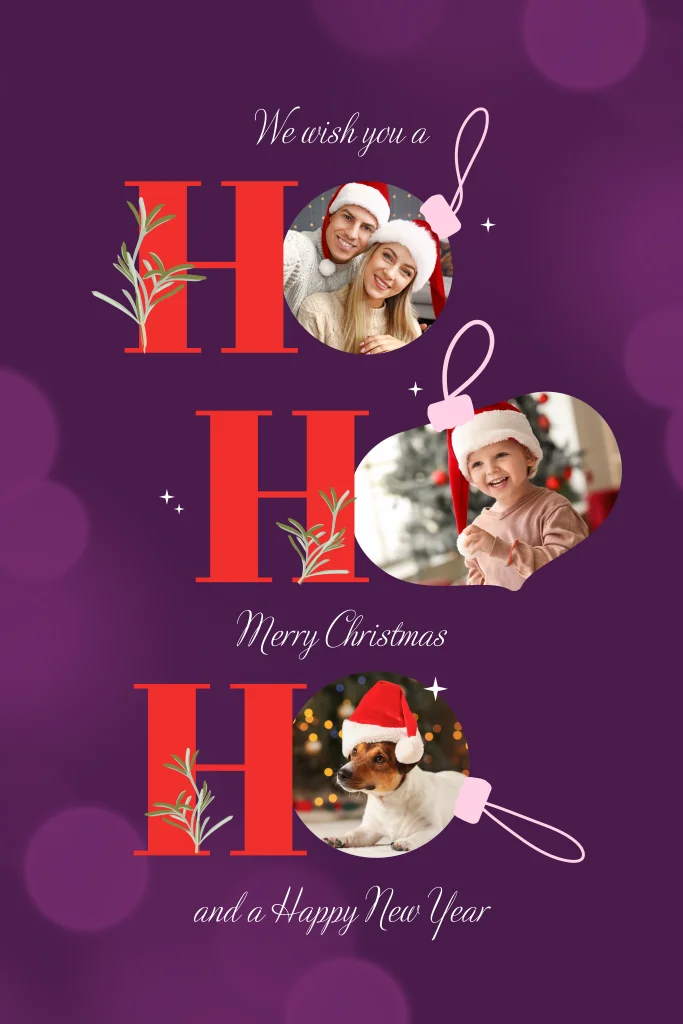 Een prachtige kerstkaart met de tekst 'We wish you a Merry Christmas and a Happy New Year'. Voeg jullie eigen foto in de editor toe in de tekst 'Ho, Ho, Ho'. Erg origineel! De ronde hoeken van deze kaart zorgen voor een speels effect.