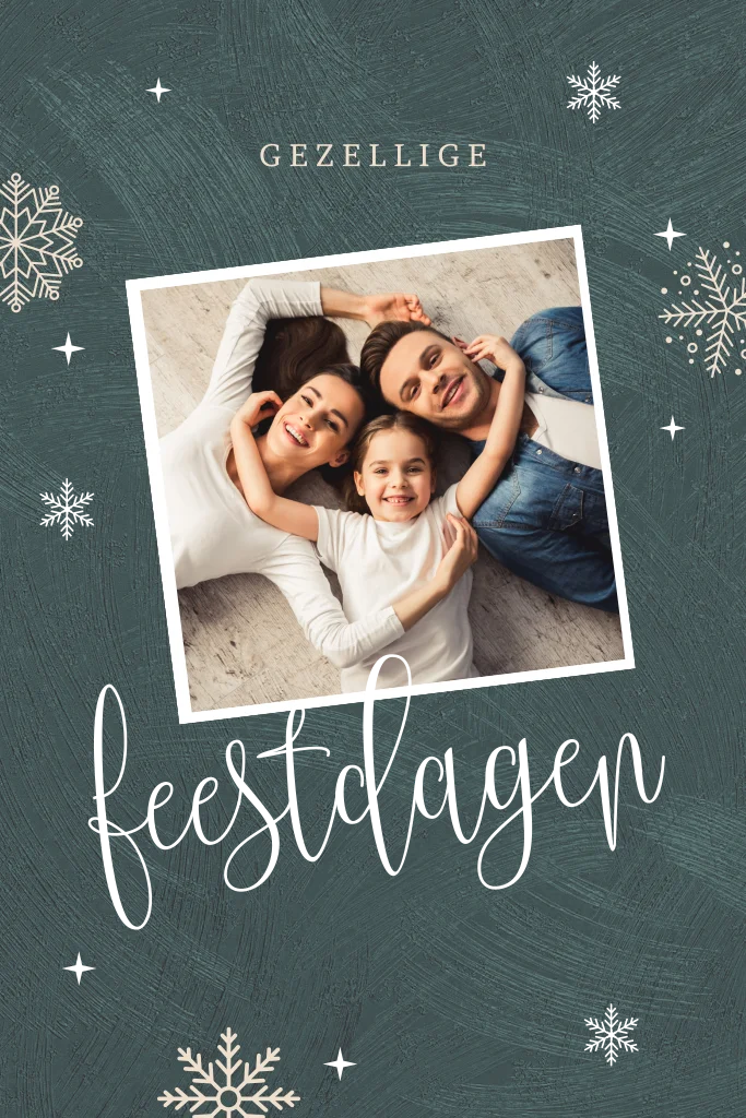 Hippe foto kerstkaart met goudfolie, een chique groene achtergrond en sneeuwsterren. De foto van het gezin kan makkelijk worden vervangen door een eigen foto. Door de goudfolie krijgt de kaart een exclusieve uitstraling. Ook mogelijk met koperfolie, zilverfolie of roséfolie. Dit is aan te passen in de editor.