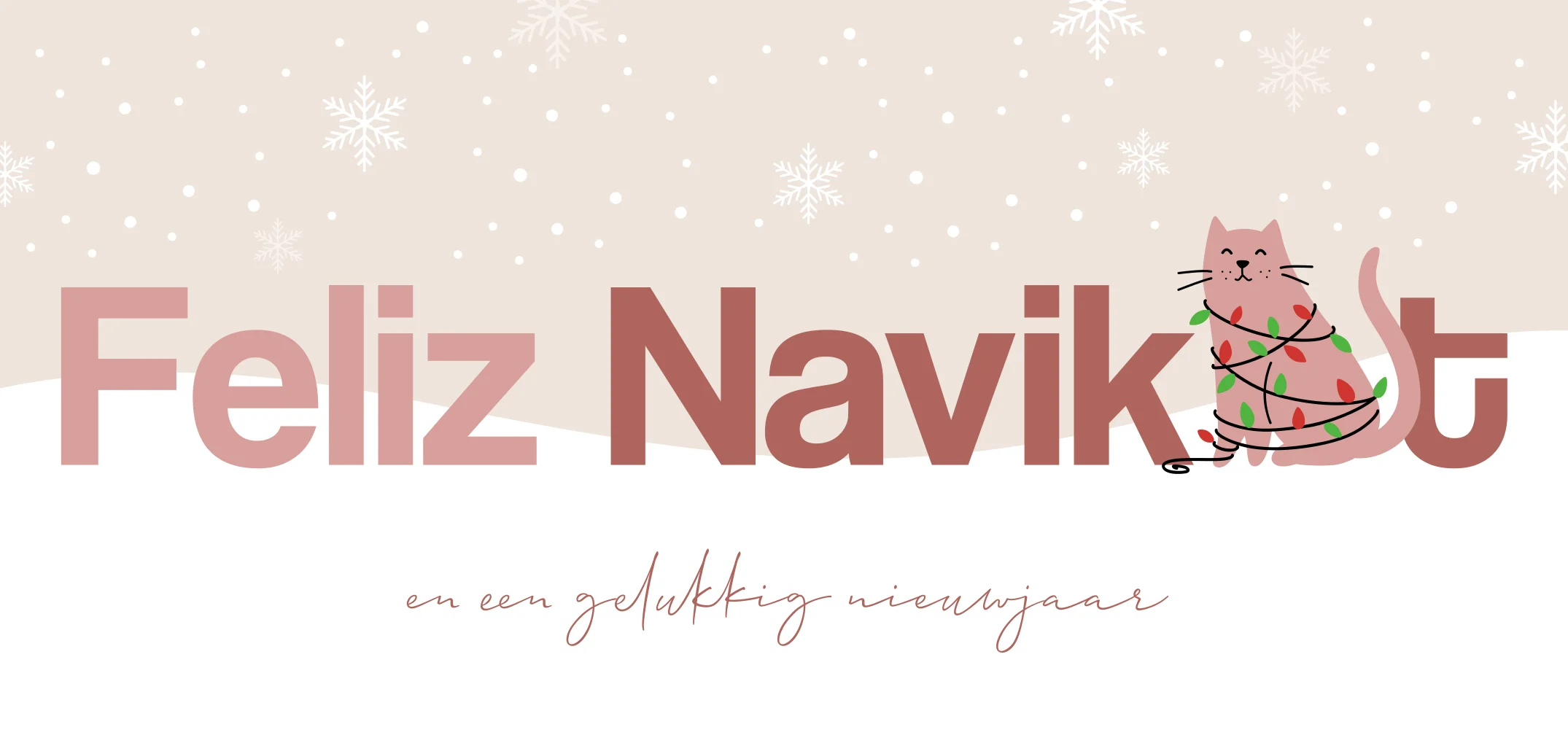 Feliz Navikat kerstkaart met kat, sneeuw en kerstverlichting