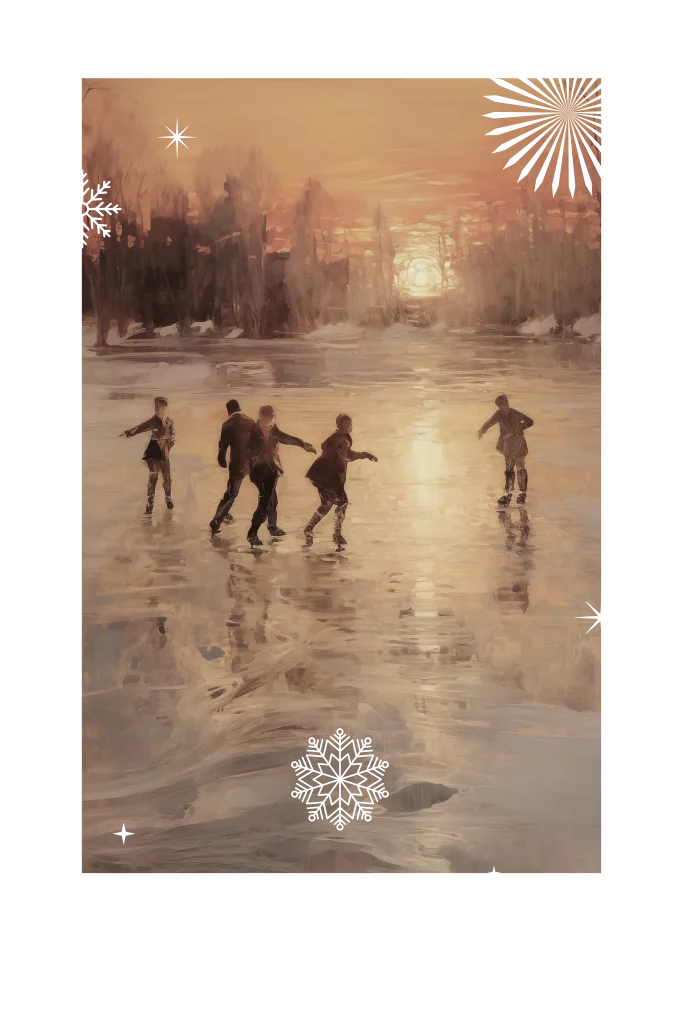 Kerstkaart met aquarel geschilderd landschap met schaatsers en folie
