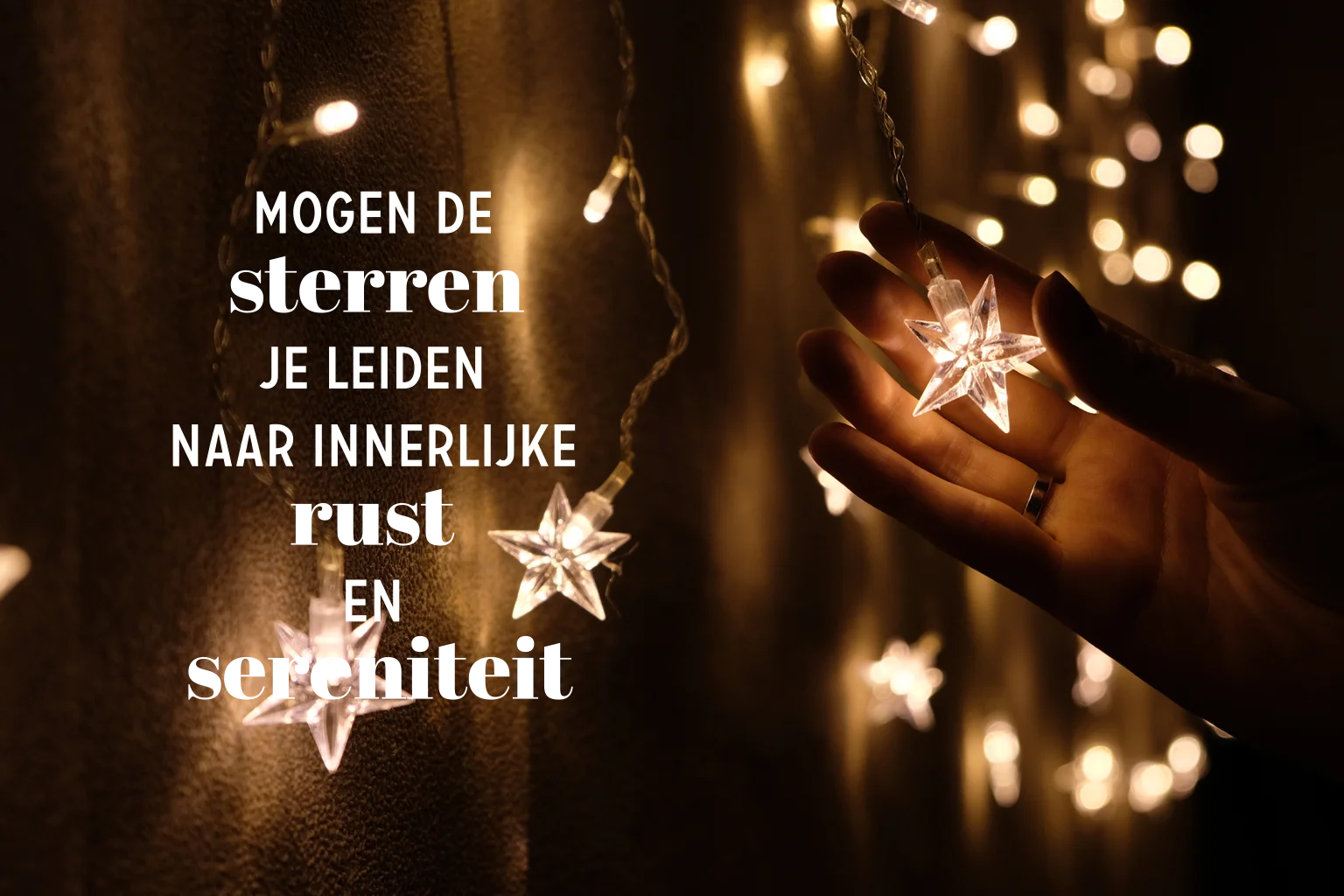 Een spirituele kerstkaart om iemand fijne feestdagen toe te wensen. Op deze kaart zie je een sfeerbeeld van een lichtslinger met sterretjes. Op de voorkant staat de tekst ´Mogen de sterren je leiden naar innerlijke rust en sereniteit´. Pas deze kaart naar eigen wens aan in onze online editor en verspreid deze spirituele kerstkaart.