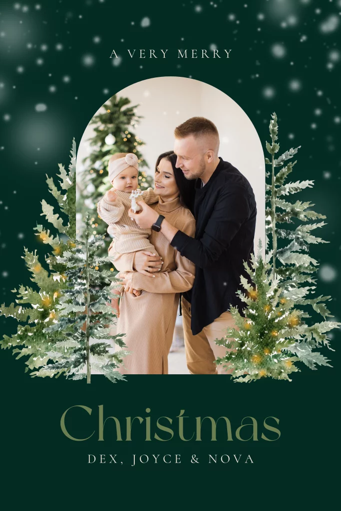 Een fantastische kerstkaart met eigen foto! Voeg jullie eigen kerstfoto toe in de boogvorm van deze kerstkaart. Jullie eigen kerstfoto zorgt voor de persoonlijke touch. Op de achtergrond van deze kaart zie je sneeuwvlokken en naast het fotokader kerstbomen. Pas deze stijlvolle kerstkaart naar eigen wens aan in onze online editor en verstuur een warme kerstgroet.