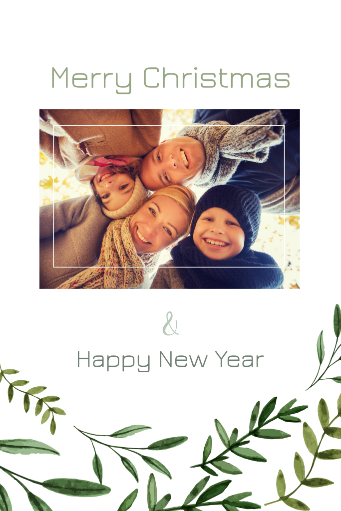 Een stijlvolle kerstkaart met botanische takjes en eigen foto. De teksten en kleuren zijn aan te passen in de editor.