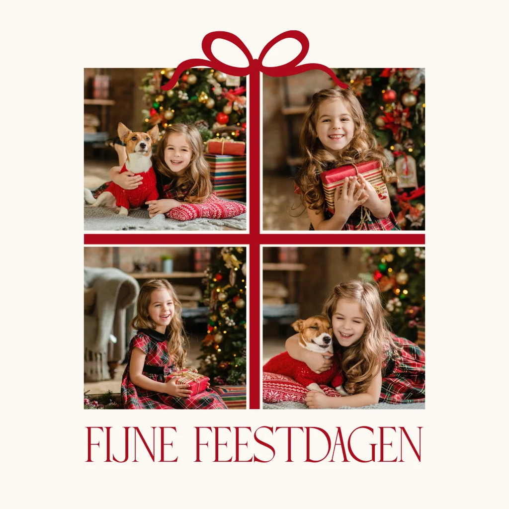 Vrolijke kerstkaart in een warme kerstsfeer. Op deze kerstkaart zie je een fotocollage in een cadeautje met strik. Voeg in de editor eenvoudig je eigen foto's toe aan de collage. Hulp nodig met ontwerpen? Ons team helpt je graag.