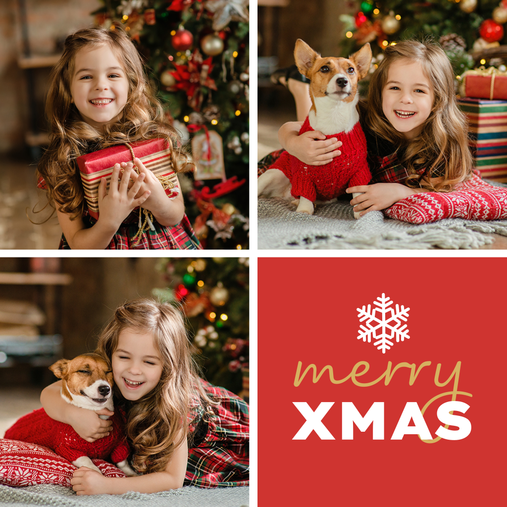 Kerstkaart met vier vlakken waarop je een collage van eigen foto's kunt plaatsen. In het laatste vlak een typische rode kerstkleur met de tekst 'Merry Xmas' met sneeuwster. Pas de kaart naar je eigen wensen aan in de editor.