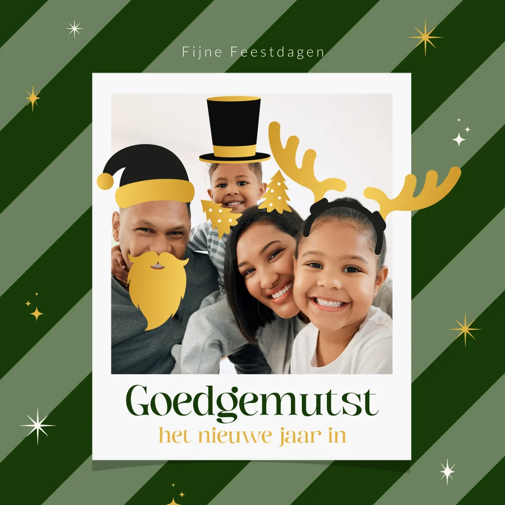 Goedgemutst het nieuwe jaar in! Wens de ontvanger van deze kaart fijne feestdagen en een goedgemutst nieuwjaar. Op deze kerstkaart zie je een fotokader waarin je je eigen kerstfoto kunt toevoegen. Maak gebruik van de gouden kerst props op je foto voor een grappig effect. De achtergrond is gestreept in groen tinten met sprankelende sterretjes. Met deze kerstkaart breng je gegarandeerd vreugde tijdens de feestdagen!