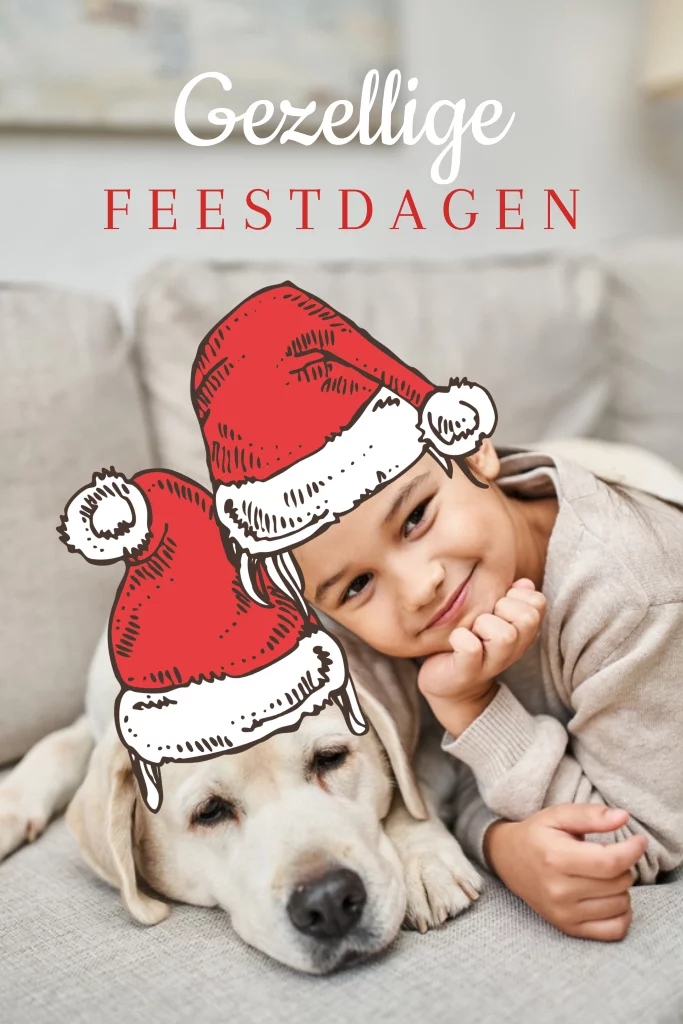 Grappige kerstkaart met ruimte voor een grote foto. De foto met daarop een hond en een kind (een meisje) is aangekleed met een kerstmuts. Deze props zijn over de foto op de kerstkaart geplaatst, wat een grappig effect geeft. Er zijn extra losse props, zoals kerstmuts, strikje, baard, enz. beschikbaar in de galerij.