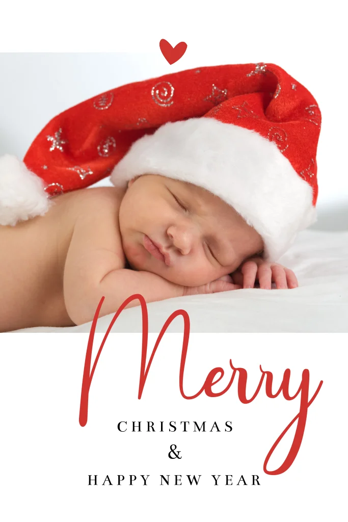 Een eerste kerst met je kindje maakt de feestdagen nóg specialer! Stuur je vrienden en familie een persoonlijke kerstgroet met deze leuke baby kerstkaart. Op deze kerstkaart plaats je je eigen persoonlijke foto. De kaart is overwegend wit met wat rode elementen.