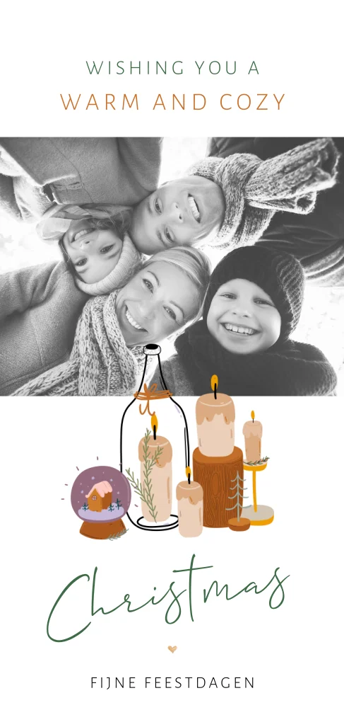 Wishing you a warm and cozy Christmas. Op deze kerstkaart voeg je een leuke foto toe en staat een illustratie van brandende kaarsen, met enkele takjes en een sneeuwbol. Deze kaart is te bewerken in de editor en naar je eigen smaak aan te passen.