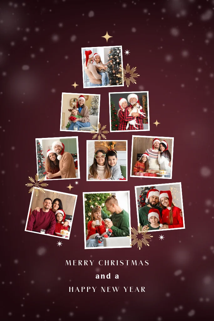 Merry Christmas and a happy new year! Pas deze superleuke kerstkaart in kerstboom vorm naar eigen wens aan. Foto's kunnen toegevoegd worden in onze editor. De antiek gouden envelopkleur maakt deze kaart helemaal in stijl af.