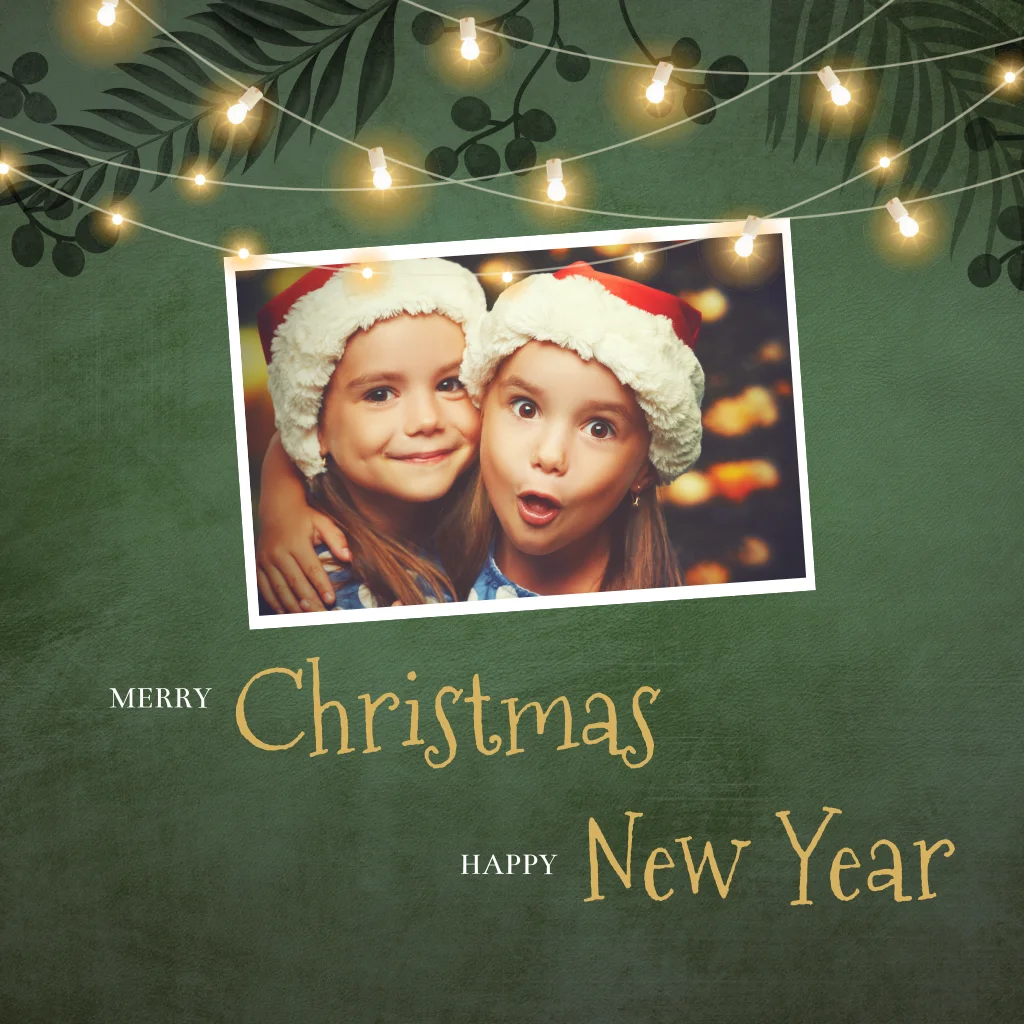 Stuur je vrienden en familie een leuke foto kerstkaart met een persoonlijke kerstgroet. Op deze kaart staan takjes met sfeervolle brandende lichtjes op een groene achtergrond. Lettertypes en kleuren zijn aan te passen in de editor.