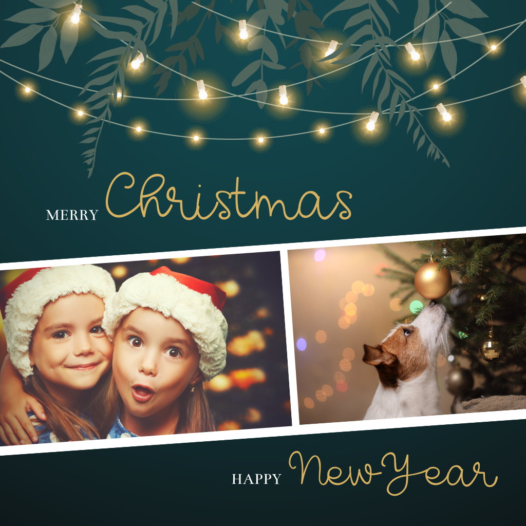 Sfeervolle kerstkaart met takken en brandende lampjes. Plaats je eigen foto en maak zo je eigen persoonlijke kerstkaart. Lettertypes en kleuren pas je aan in de editor.