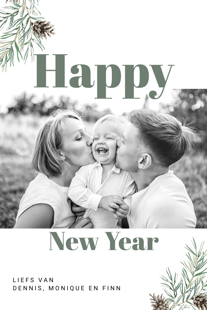 Hippe kerstkaart met dennentakjes en foto. Op deze kaart zijn verschillende lettertypes gebruikt. Zowel de kerstgroet als jullie namen staan op de voorkant van dit kaartje. De achterzijde van deze hippe kaart is gevuld met de takjes met dennenappels. Wil je hier liever tekst toevoegen? Dit is gemakkelijk aan te passen in de editor.