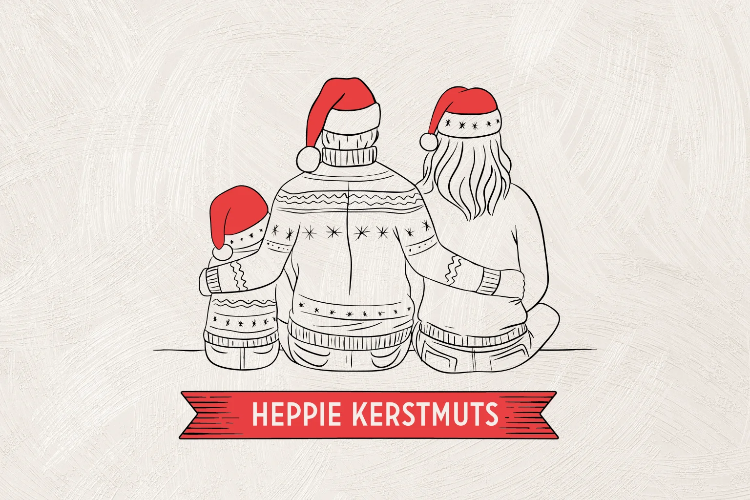 Heppie kerstmuts kerstkaart met gezin en lijntekening