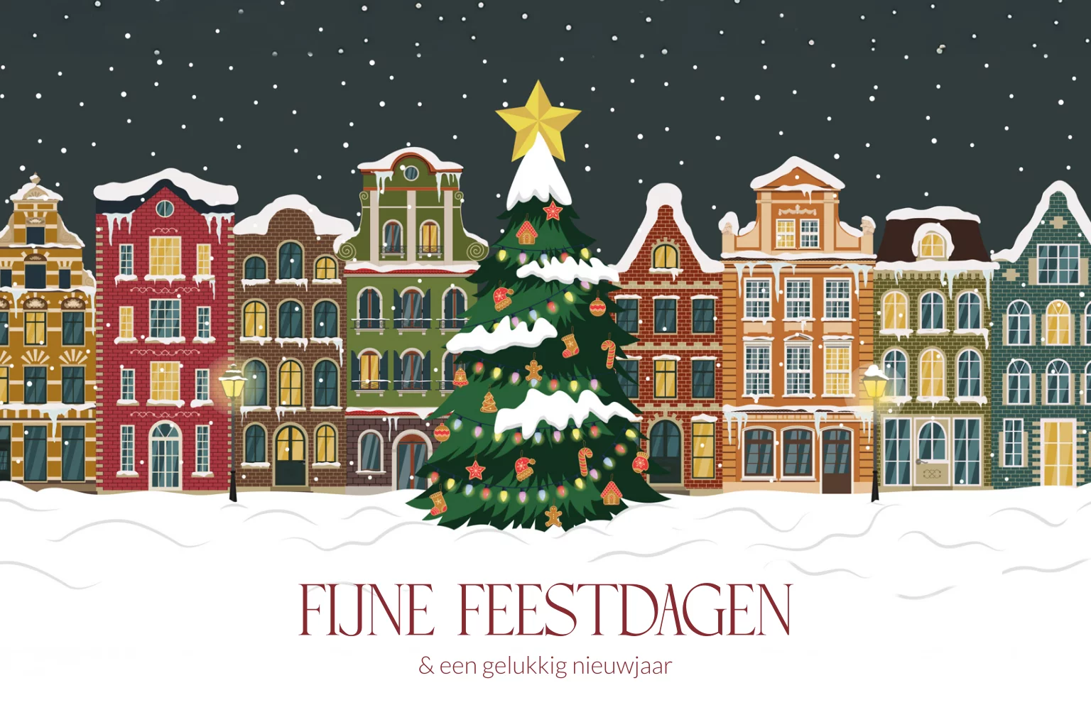Een schitterende kerstkaart met grachtenpanden, sneeuw en een kerstboom illustratie. Deze gezellige oer hollandse grachtenpanden in de sneeuw stralen een warme en nostalgische sfeer uit. Pas deze kerstkaart naar eigen wens aan in onze online editor en verspreid de feestvreugde.